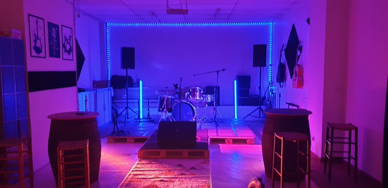 Réservation privative : répétition, cours, soirées privées. Jauge 35 personnes. Sono 2400W, table de mixage, base batterie, pied micro, lumière scène et vidéoprojecteur.